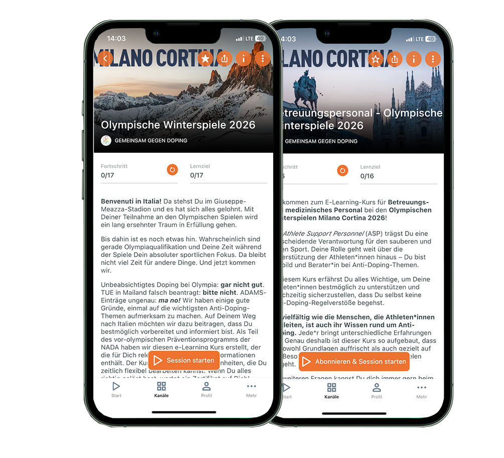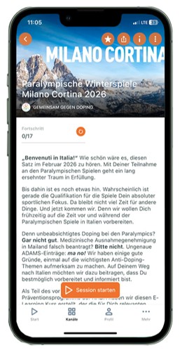 E-Learning für Sportlerinnen und Sportler zur Vorbereitung auf Milano Cortina 2026. Dieser Kurs richtet sich an alle Athletinnen und Athleten, die bei den Olympischen Winterspielen 2026 an den Start gehen. Er vermittelt kompakt und verständlich, worauf es im Anti-Doping-Kontext bei Olympischen Spielen ankommt – vor, während und nach dem Wettkampf. Der Kurs wird vom DOSB als möglicher Nachweis für eine Nominierung anerkannt.