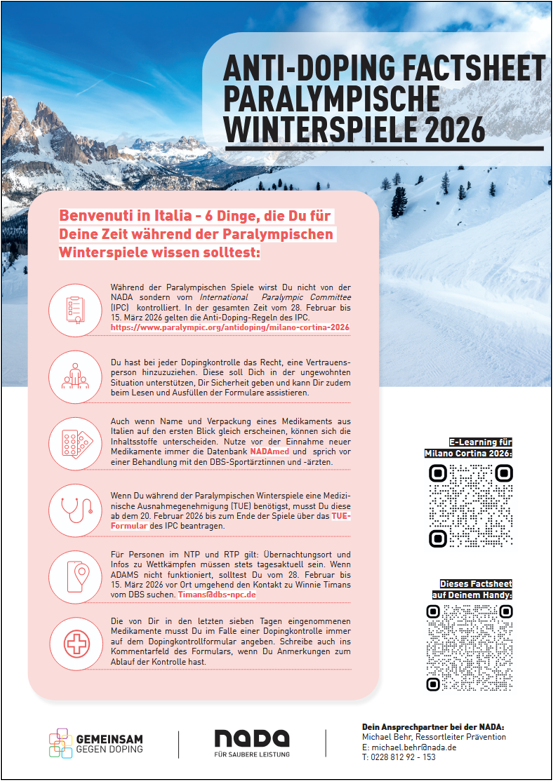 In Abstimmung mit dem Deutschen Behindertensportverband (DBS) hat die NADA ein spezielles Programm für die Teilnehmenden der Paralympischen Winterspiele 2026 entwickelt. Paralympische Spitzenathletinnen und -athleten werden gezielt aufgeklärt und in ihrer Eigenverantwortung unterstützt – angepasst an die besonderen Rahmenbedingungen und Regelwerke des paralympischen Sports.